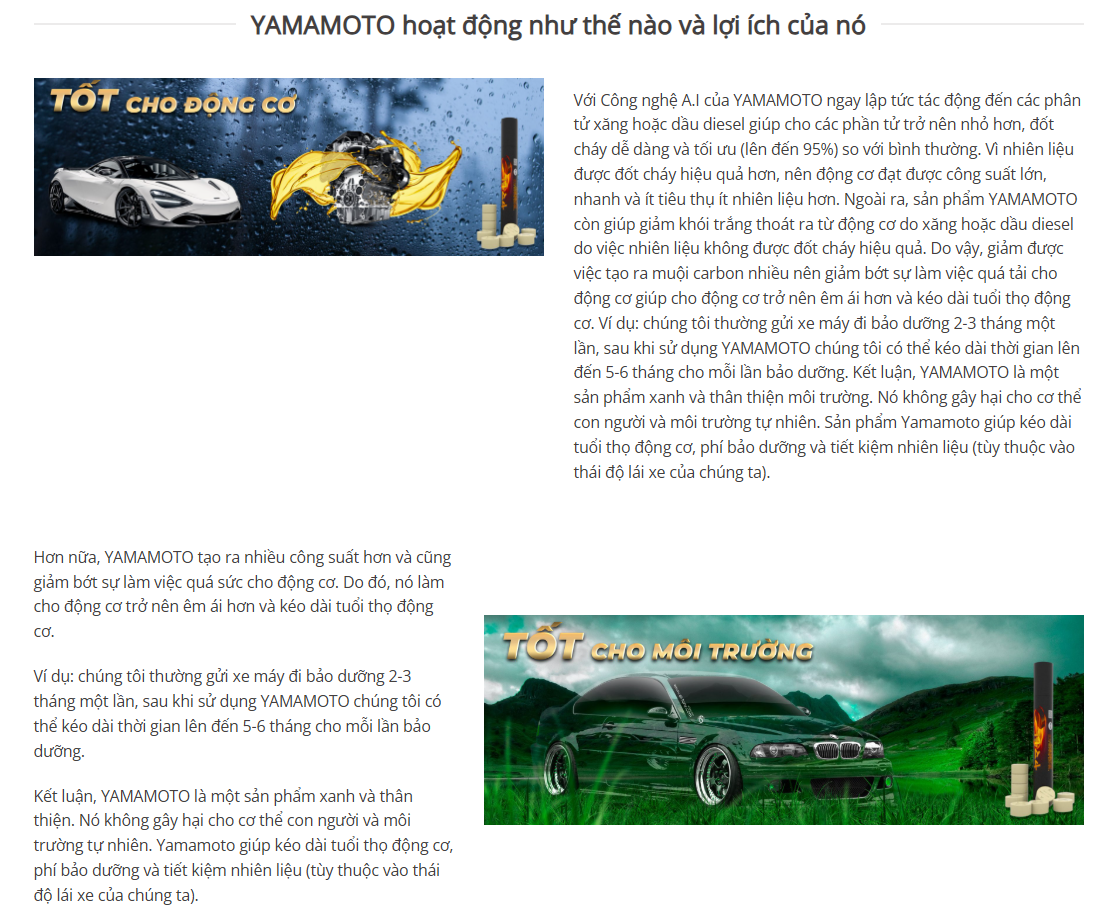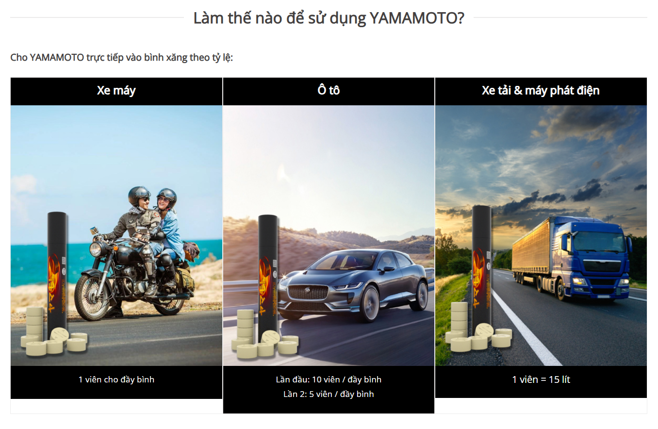 Sử dụng Viên nén YAMAMOTO để tiết kiệm xăng, bảo vệ môi trường, xe chạy mượt mà hơn, mạnh mẽ hơn, động cơ bền bỉ hơn.