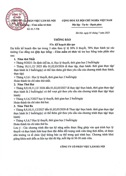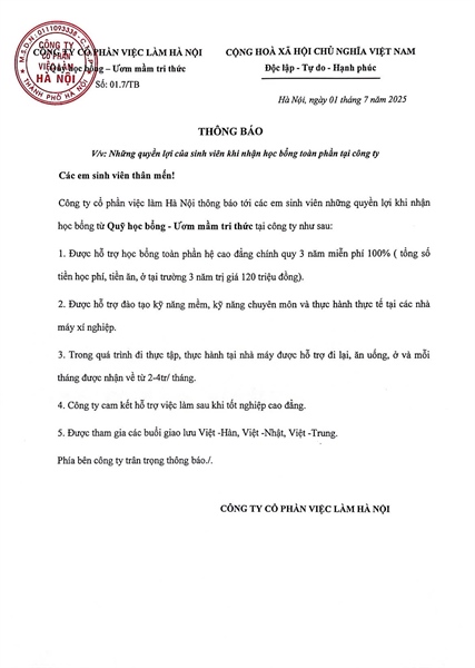 Năm 2025 Công ty cổ phần việc làm Hà Nội ký kết hợp tác với trường trao 500 suất học bổng cho con em vùng kinh tế khó khăn và các gia đình có hoàn cảnh đặc biệt