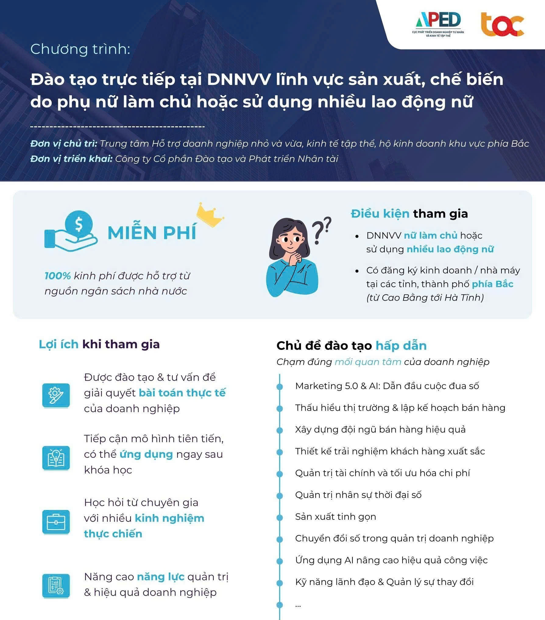 [Từ Hà Tĩnh trở ra] Đào tạo miễn phí tại Doanh nghiệp do Phụ nữ làm chủ hoặc có nhiều lao động nữ - Dành cho lĩnh vực SẢN XUẤT hoặc CHẾ BIẾN